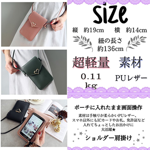 タッチパネル対応ですのでポーチにいれたままスマホを操作することが出来ます。ショルダーの長さは調節可能です。カードポケットつきで便利です!
