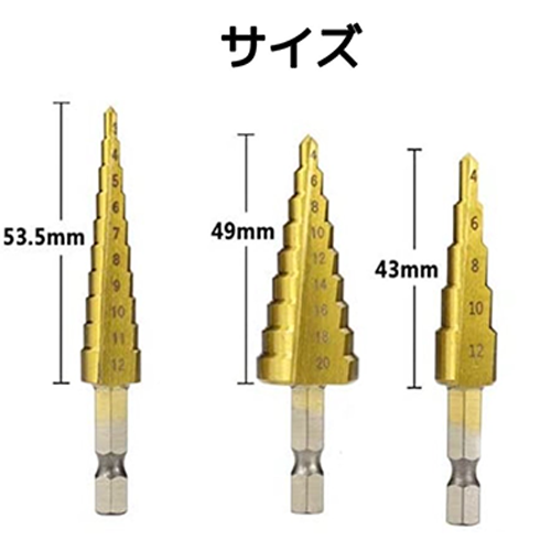 ステップドリル/スパイラルドリル/3本セット/穴あけ/12ミリ/(4-20 4-12 3-12)/タケノコドリル/チタンコーティング/六角軸/HSS鋼収納袋付/(mm)/ステンレス/おすすめ/厚板/40mm/インパクト用