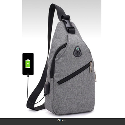 USBポート搭載で、モバイルバッテリー(別売り)をつなげばバッグを開けずにスマートフォンの充電ができるボディバッグです。